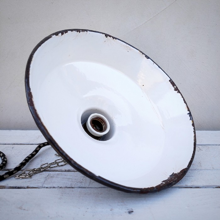 Ripulita con cura, porta lampadina E27 originale dell'epoca, cavo elettrico bianco e nero, gancetto e catenella.