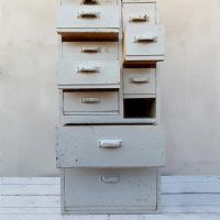 Cassettiera porta minuterie vintage in legno e compensato, proveniente da una vecchia falegnameria.