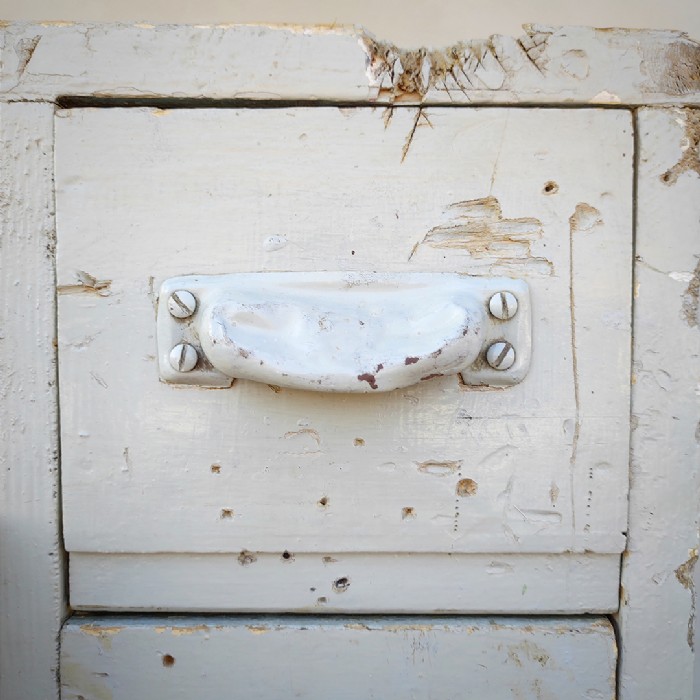 Vernice originale colore grigio pastello chiaro e maniglie in lamiera.