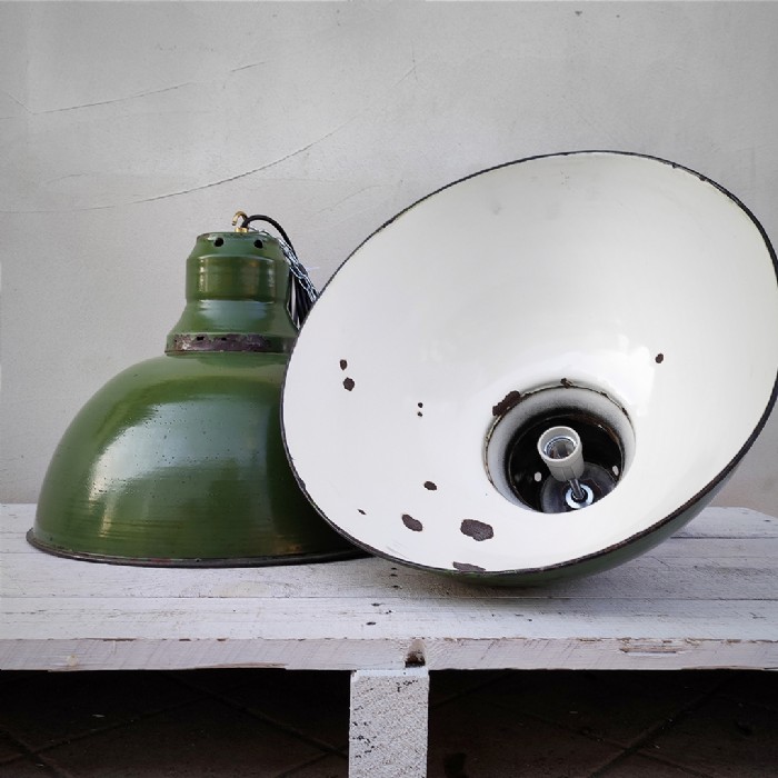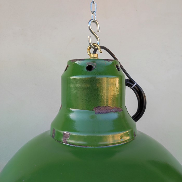 Rara Lampada industriale in ferro smaltato di colore verde lucido a sospensione, originale vintage.