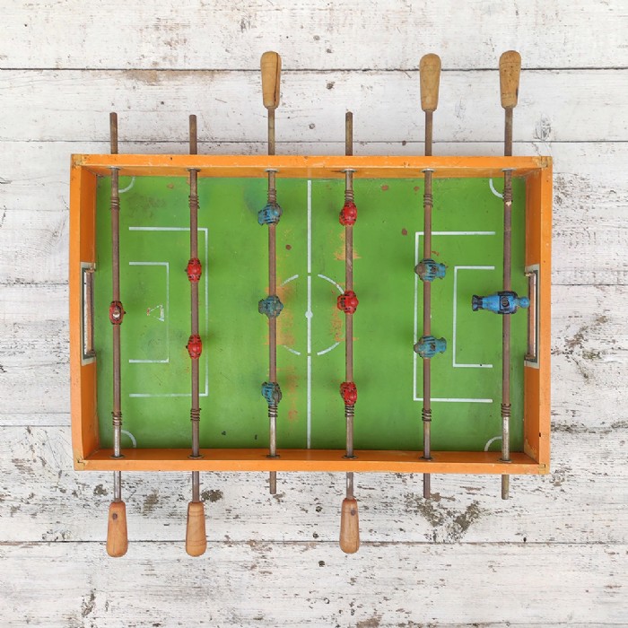 Struttura in legno con calciatori in latta.