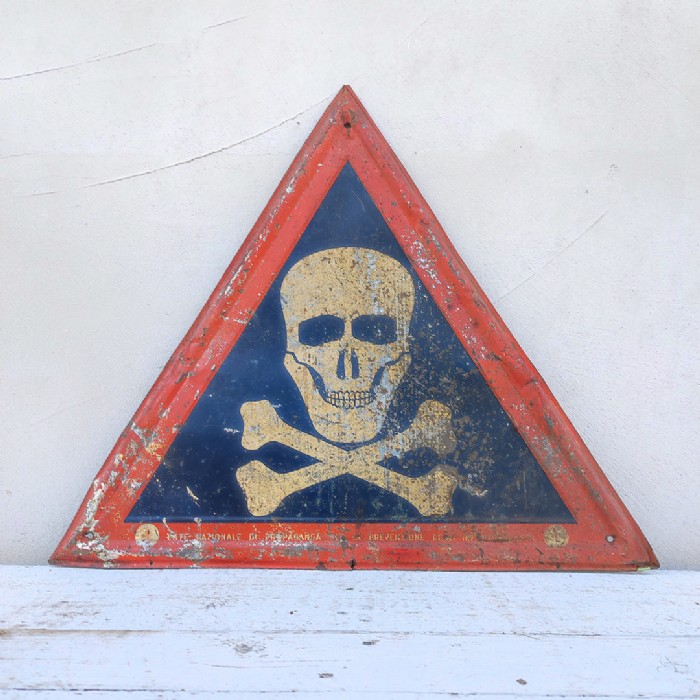 Cartello storico in lamiera di forma triangolare dell'E.N.P.I. Ente Nazionale Prevenzione Infortuni che rappresenta un teschio l'illustrato, simbolo del peicolo di morte, fine anni '30 / '40.