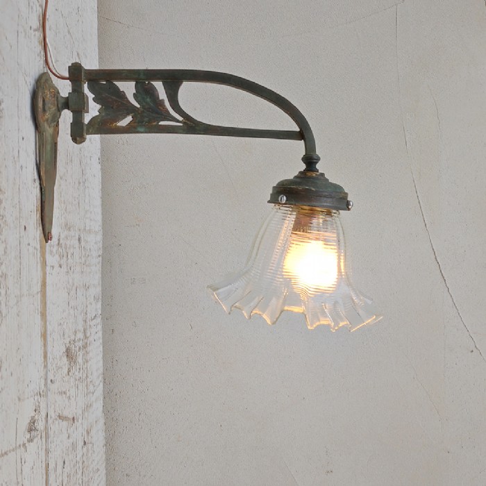 Oggetto n.443Lampada da parete vintage di stile Art Nouveau con struttura in ottone brunito, decoro floreale e paralume in vetro trasparete che ricorda un fiore.